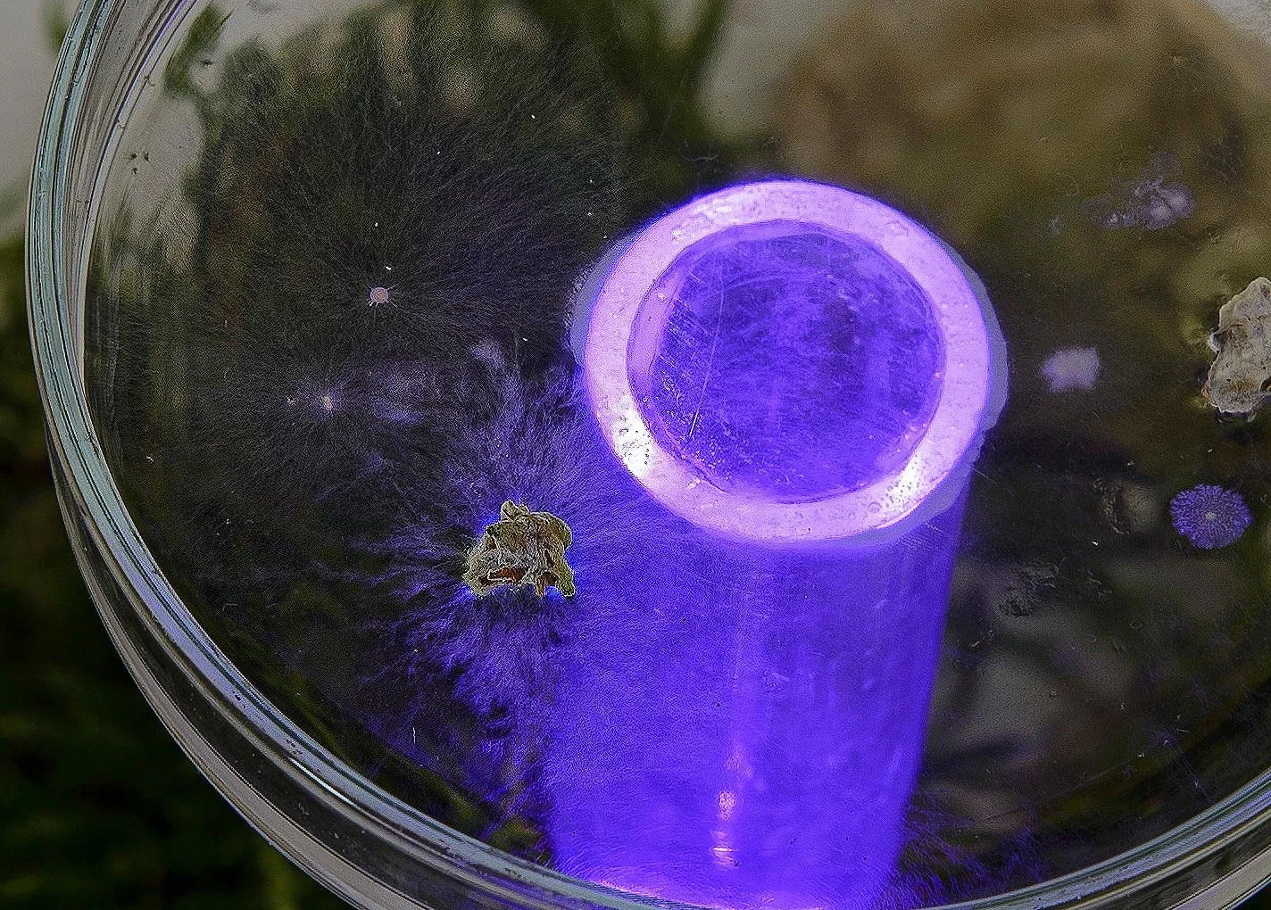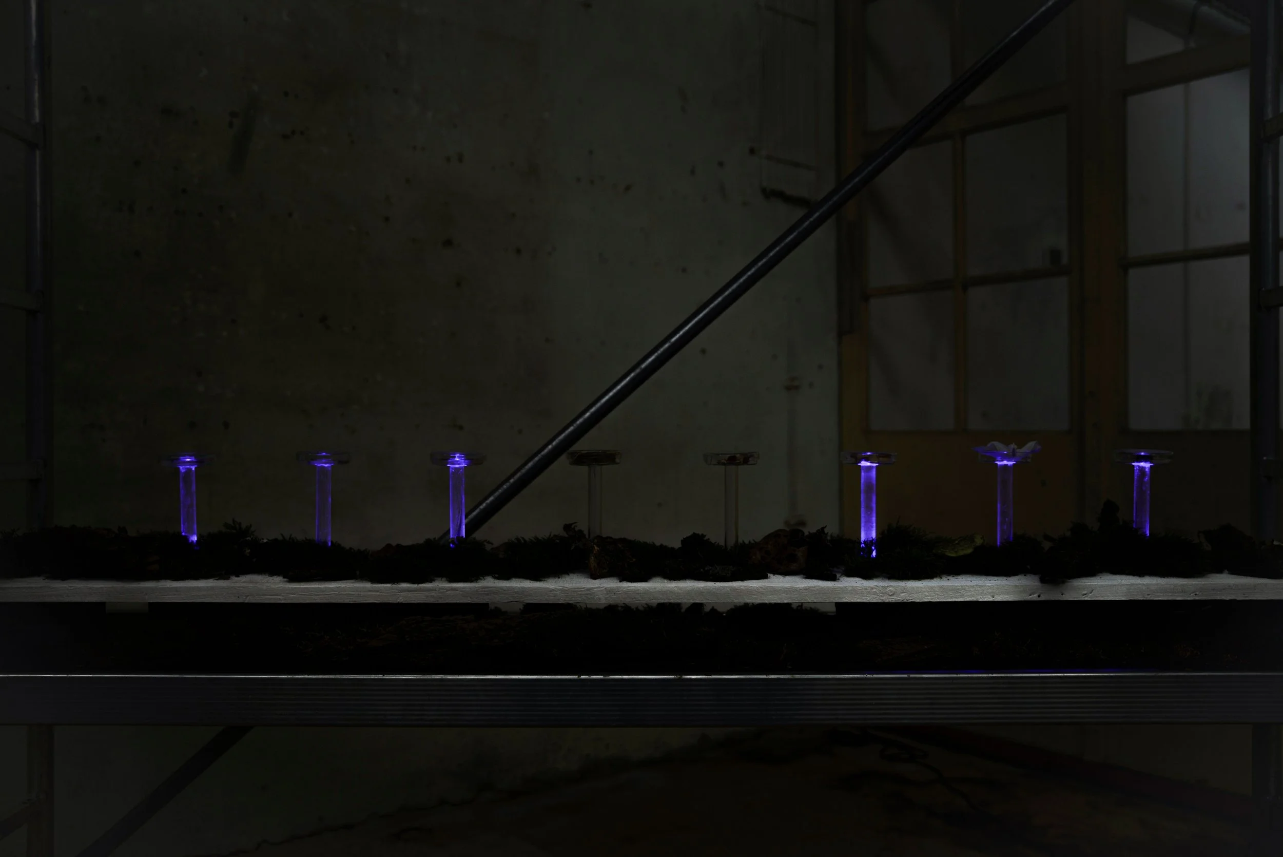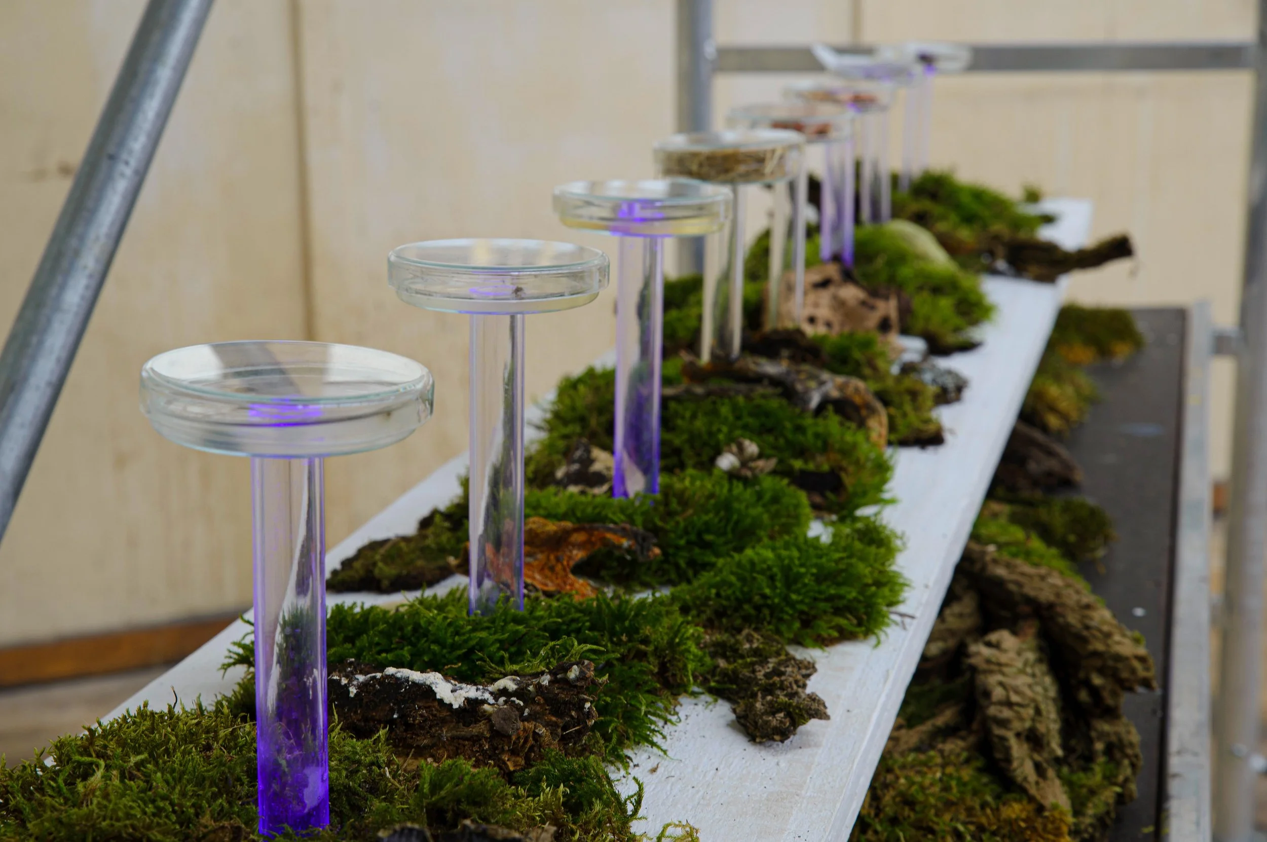 Experiments carried out at FabrikCulture in petri dishes. They contain agar-agar and mycelium «the invisible architect of life». The aesthetics of lush elements from the forest is contrasted through acrylic glass, construction material and ultraviolett light. The mycelium spreads over the course of the exhibition. Each mycelia colony creates a unique shape and personality.