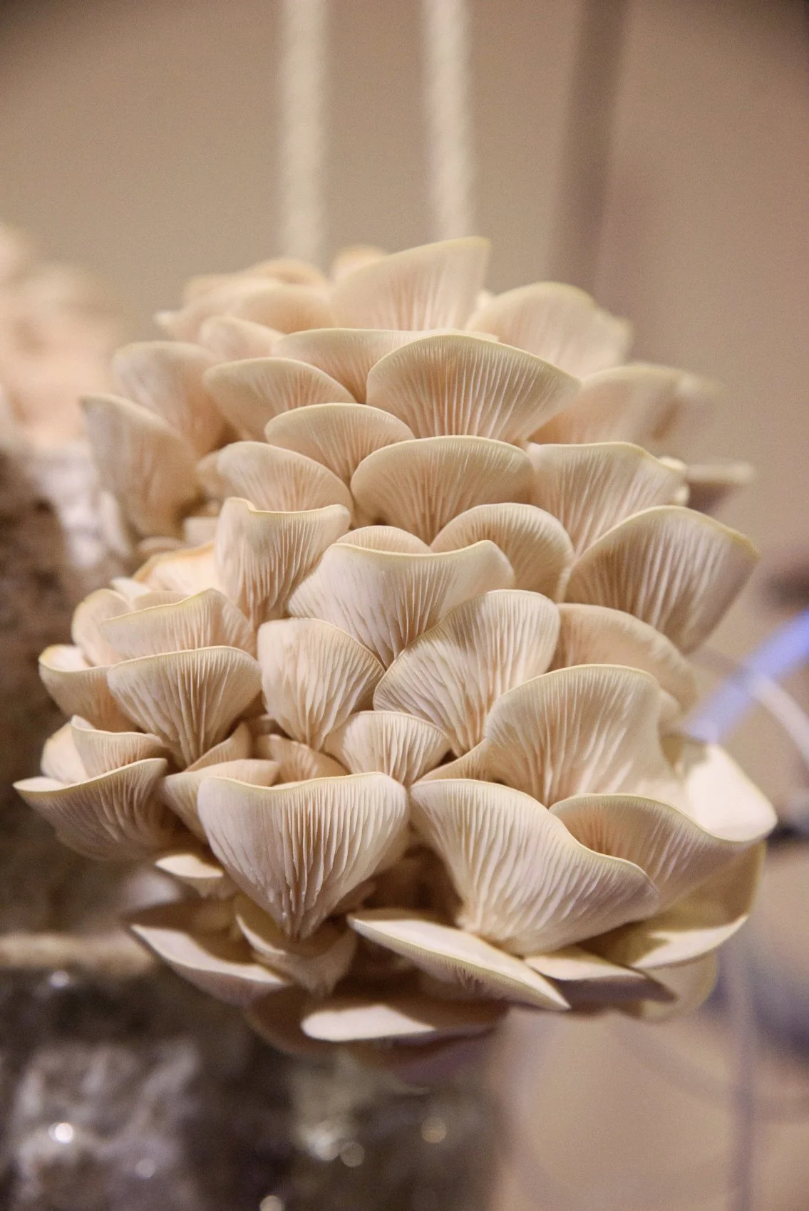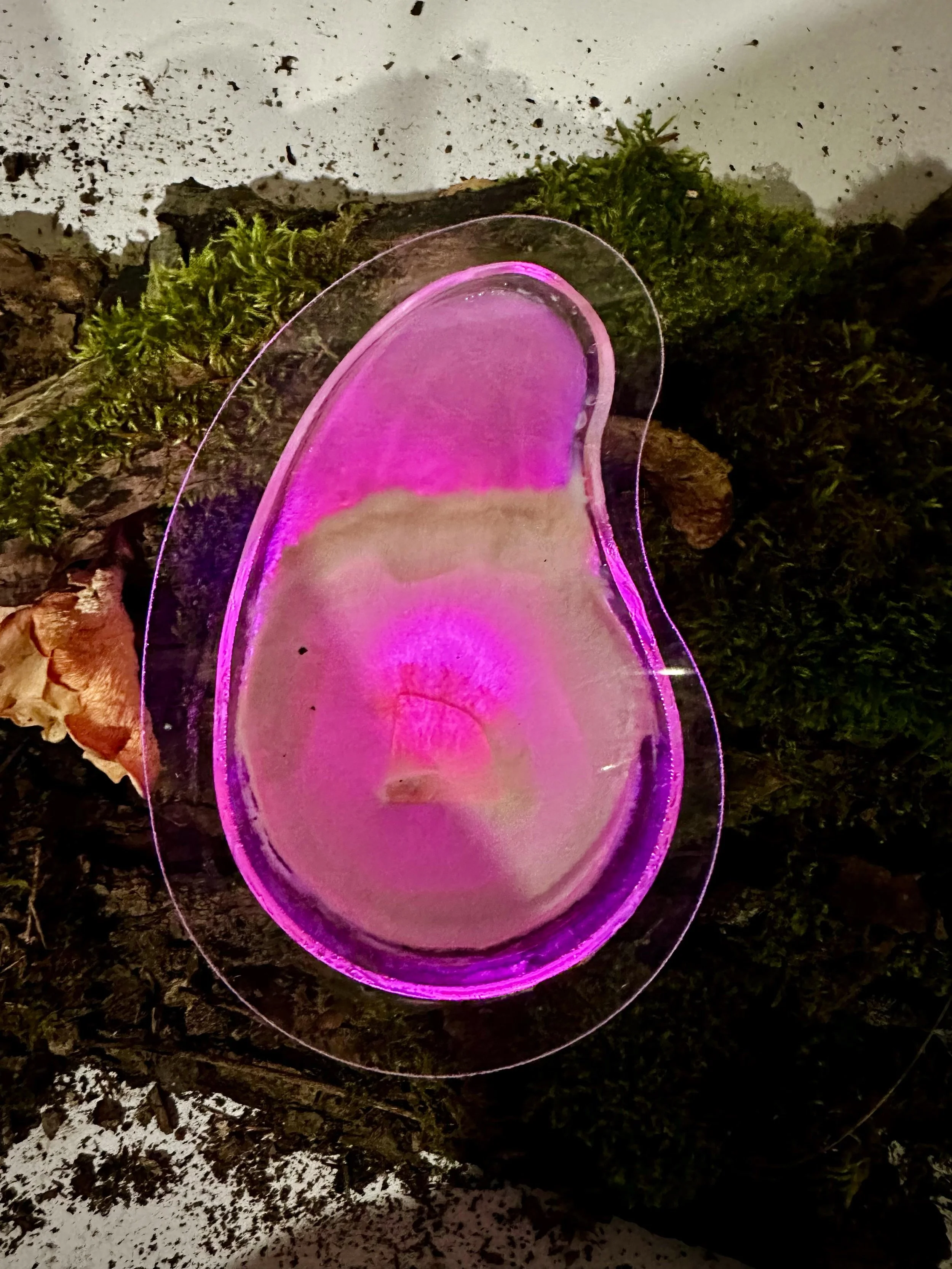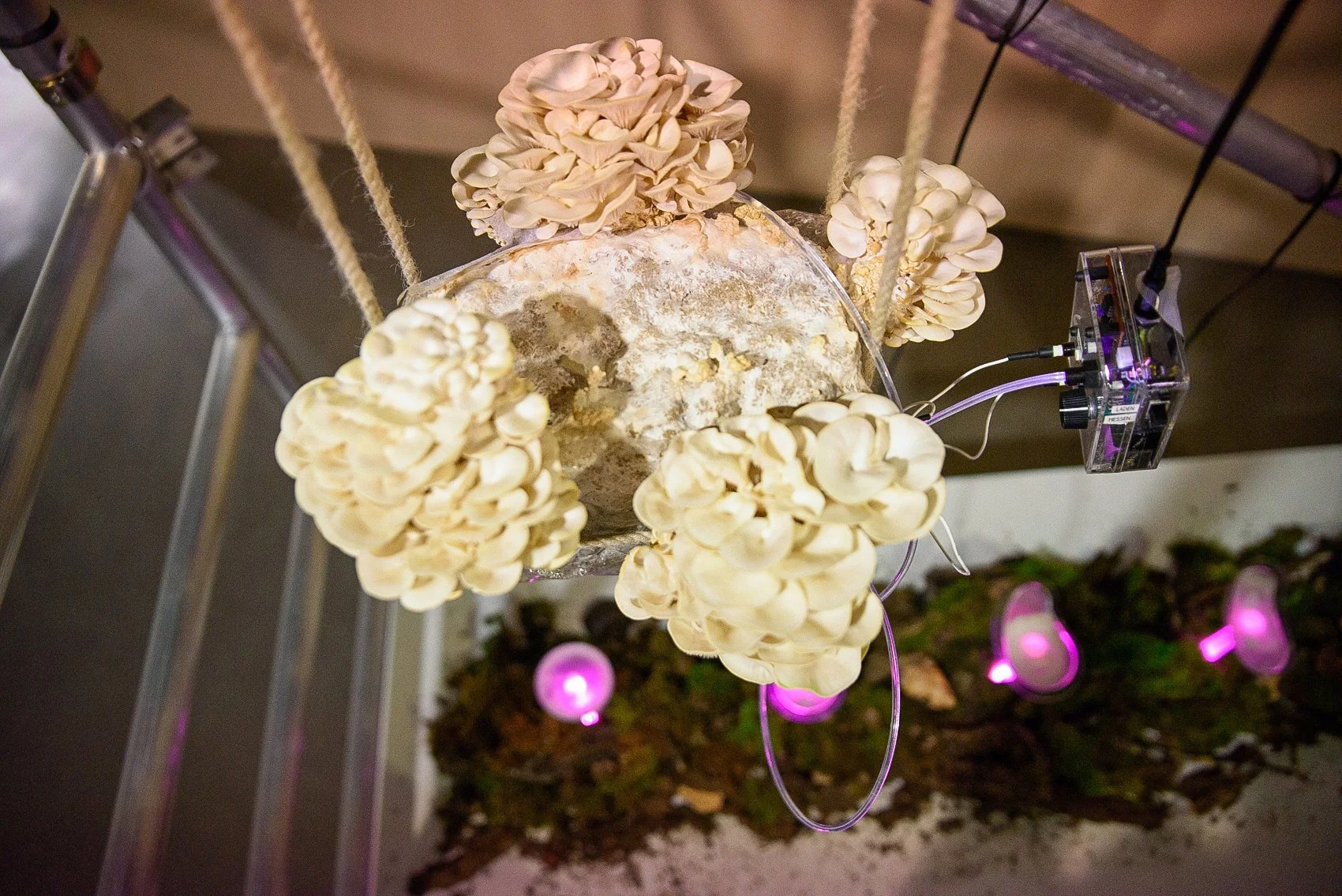 Experiments III is a further development of Experiments II upon request from the HEK (House of Electronic Arts) for the exhibition Other Intelligences. Glas blown petri dishes in different shapes contain agar-agar and mycelium, the invisible architect of life. The aesthetics of lush elements from the forest is contrasted through acrylic glass, construction material and ultraviolett light. The mycelia colonies will spread over the course of the exhibition in unique shapes. The shapes of the petri dishes are derived from notions about the form of consciousness from various sources; AI, indigenous mexican wisdom and the artists own imagination. Above, electrodes capture the bioelectrical signals emitted by growing mushrooms, amplified by an electronic circuit that transforms the energy into pulses of light. This light travels along a glass fiber, bringing together the materiality of the World Wide Web with fungi, the interfaces of the Wood Wide Web.